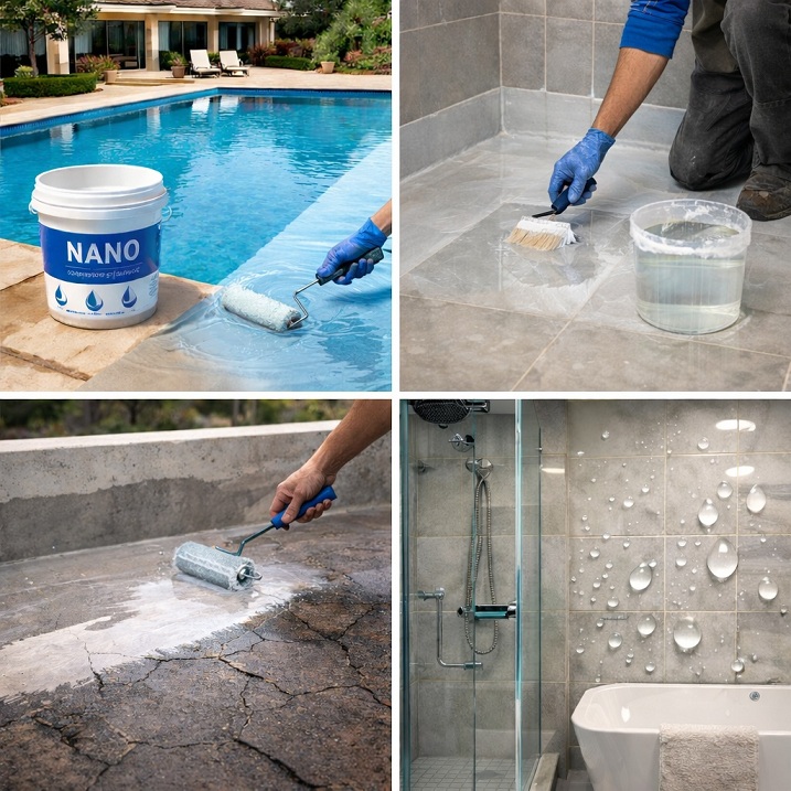 - در حمام و توالت به علت وجود پلیکا و کوچکی محل اجرای ایزوگام و یا قیرگونی بسیار مشکل است پس از سیمانکاری سطوح عایق استخر آبی نانو کاسپین را با اطمینان کامل بر روی سیمان و حتی روی پلیکا بزنید.